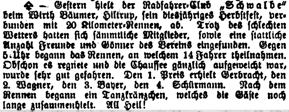 Aber auch die Konkurrenz schlief nicht. Im Dorf waren die Wirtschaften Vogt, Stähler [später: Rohrkötter], Prinz, Buermann, Soetkamp [später: Lohmann, danach Elfers], Heithorn und Scheller mit ihren schönen Kaffeegärten für die Münsteraner beliebte Ausflugsziele. Hiltrup war das Dorf mit den meisten Kaffeekannen rund um Münster – und dem billigsten Gerstensaft bei Bäumers im „Dicken Weib“.