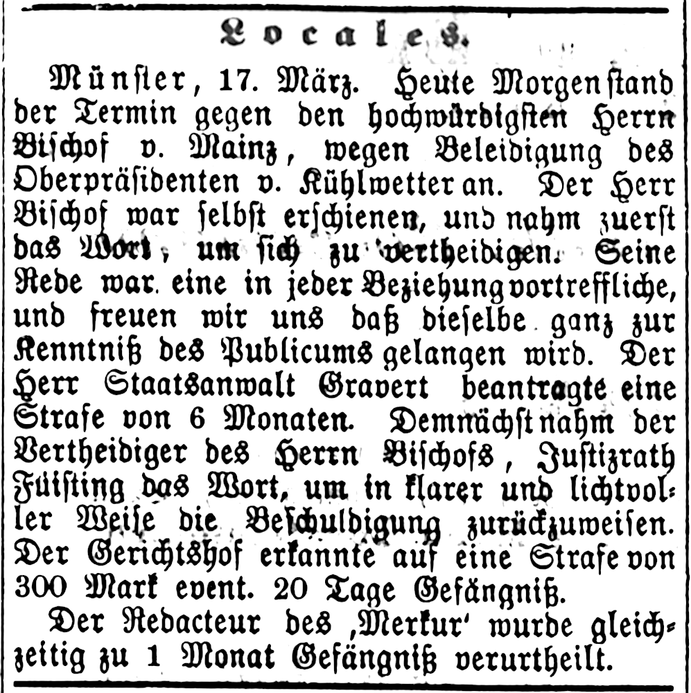 Papstes Pius IX, zuletzt 1870 manifestiert im Unfehlbarkeitsdogma. Der münstersche Polizeipräsident von Gedicke ließ Haussuchungen durchführen. Der Chefredakteur des von Coppenrath herausgegebenen Westfälischen Merkur Dr. Ludger Suing hatte 1873 einen Wahlaufruf des Zentrums unterzeichnet. 1874 wurde er erneut zu einer Haftstrafe verurteilt und vor Rechtskraft verhaftet. Er erhielt anschließend von Josef Hötte vorübergehend Asyl in Haus Heidhorn. Der münstersche Bischof Brinkmann wurde nach mehreren Strafprozessen einige Monate inhaftiert und ging 1875 für 9 Jahre ins Exil in den Niederlanden.