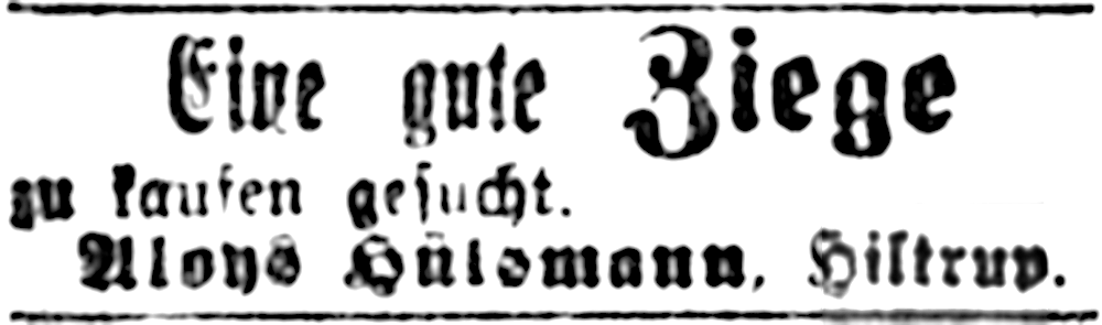 In einer Versammlung der Sektion zur Hebung der Ziegenzucht im Stadt= und Landkreise Münster unter Leitung des Hiltruper Hauptlehrers Wesseling wurde von einem Lehrer aus Gelsenkirchen vorgetragen: „In Familien mit Ziegenhaltung ist die Sterblichkeit der Säuglinge weniger groß“ (Münsterischer Anzeiger 29.10.1908).